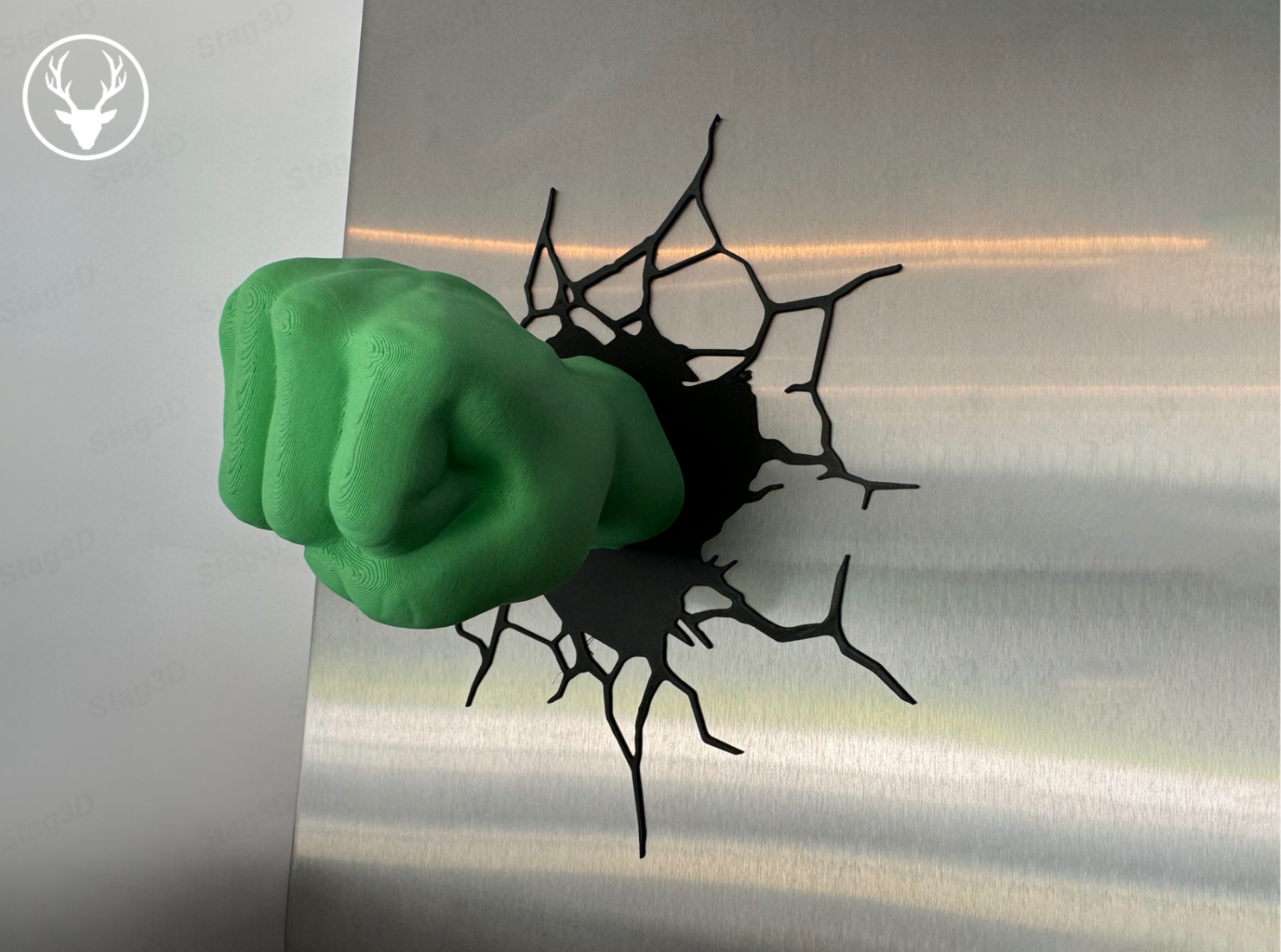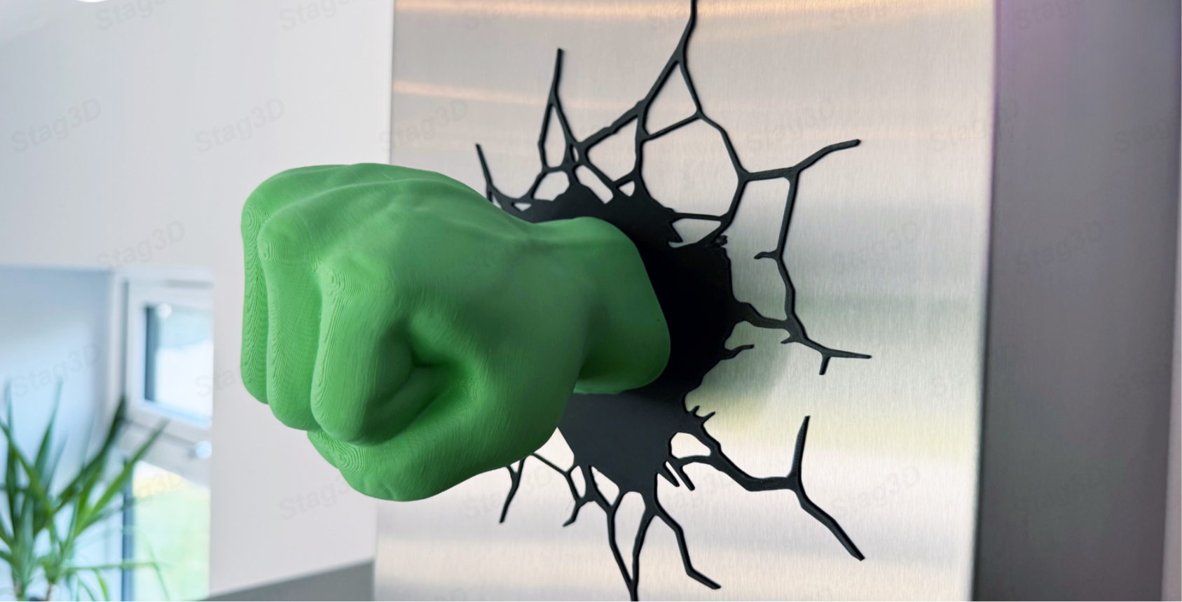 - A superhero-style green fist breaking through a cracked wall — three-dimensional impact built to impress.